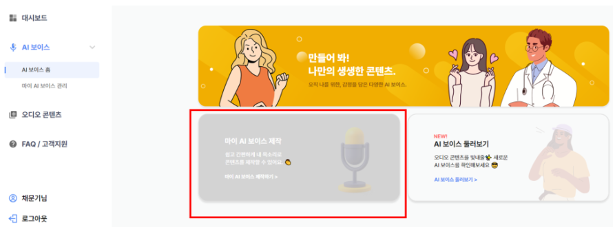 ▶ '마이 AI 보이스 제작' 이라는 기능은 나의 목소리를 샘플로 입력해서 등록한 후 텍스트로 타이핑 했을때 알아서 내가 더빙한것 처럼 만들 수 있습니다.