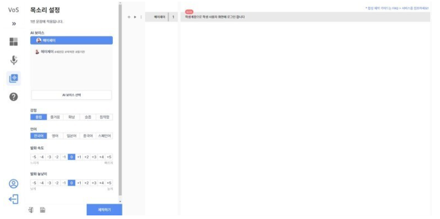 ▶ AI 보이스의 세부적인 상태를 선택하실 수 있으며, 오른쪽에 텍스트를 입력하신 후 '제작하기' 버튼을 클릭해주시면 됩니다.