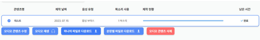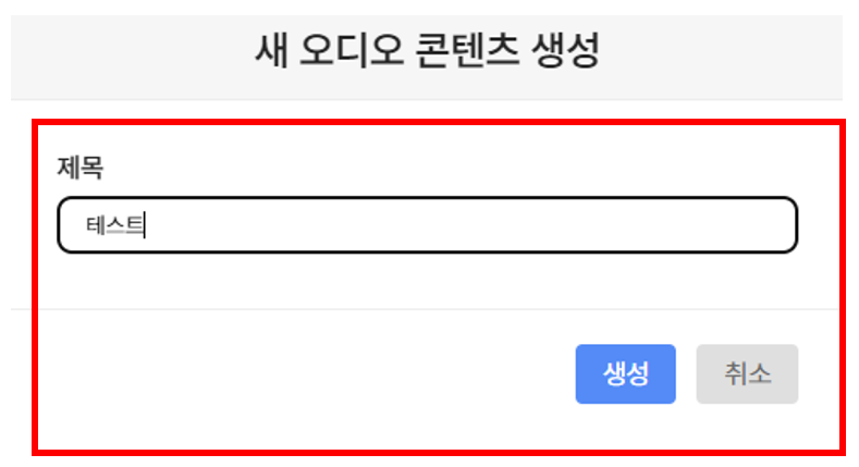 ▶ 오디오 콘텐츠 생성할 제목을 입력해주시고 '생성' 버튼을 클릭해주시면 됩니다.