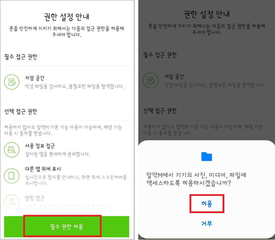 2. 권한 설정 안내에서 '필수 권한 허용'을 클릭해주시고, 기기의 사진, 미디어, 파일 액세스의 ;허용'을 클릭해주시면 됩니다.