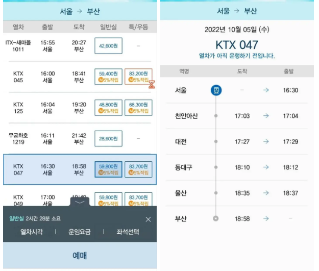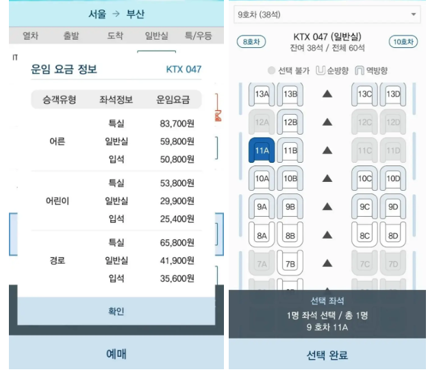 ▶ '열차 조회하기' 클릭 하시면 해당 열차 출발/도착시간을 확인하실 수 있으시으며, 일반실&특/우등에 따른 요금을 확인하시고 선택하시면 됩니다.