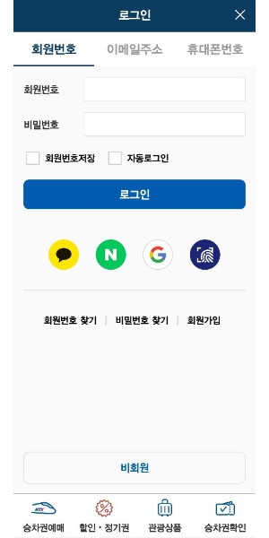 ▶ 코레일톡 앱을 실행하시면 로그인 화면을 통해 로그인을 하셔서 이용하시면 편리하십니다.비회원으로 예매 가능합니다.카카오톡, 네이버, 구글아이디로 바로 가입할 수 있기 때문에 가입하기 번거롭지 않습니다.