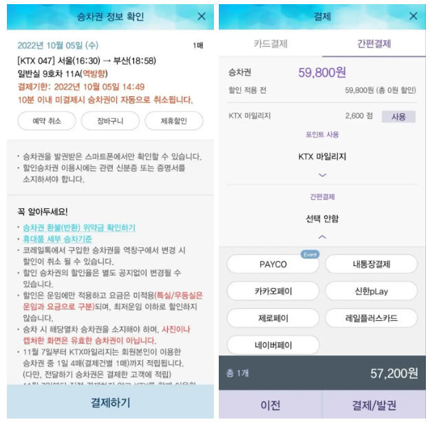 ▶'선택완료' 시 승차권 정보 확인을 통해 한번 더 확인하신 후 '결제하기'를 클릭해주시면 됩니다. KTX 마일리지가 있으시면 마일리지만큼 할인이 가능하며 원하는 결제방식을 선택하셔서 '결제/발권/을 누르시면 티켓 발권이 완료됩니다.