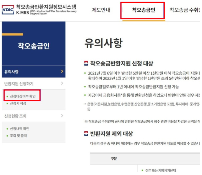 ▶ 상단 매뉴 중 '착오송금인'을 클릭하신 후 하부 측면 메뉴에서 '신청대상여부 확인'을 클릭해주시면 됩니다.