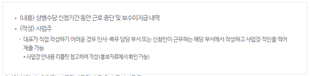 - 다만, 예외적으로 상기 대리인이 없고 중한 상병으로 본인 신청이 어려울 경우 상병수당 진단서 발급 의료기관 또는 사업장에서 신청 가능 (이 경우 홈페이지 신청 불가)