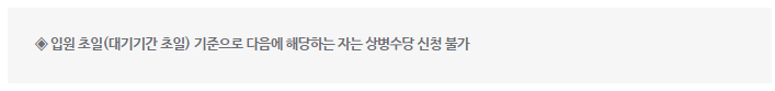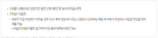 - 다만, 예외적으로 상기 대리인이 없고 중한 상병으로 본인 신청이 어려울 경우 상병수당 진단서 발급 의료기관 또는 사업장에서 신청 가능 (이 경우 홈페이지 신청 불가)
