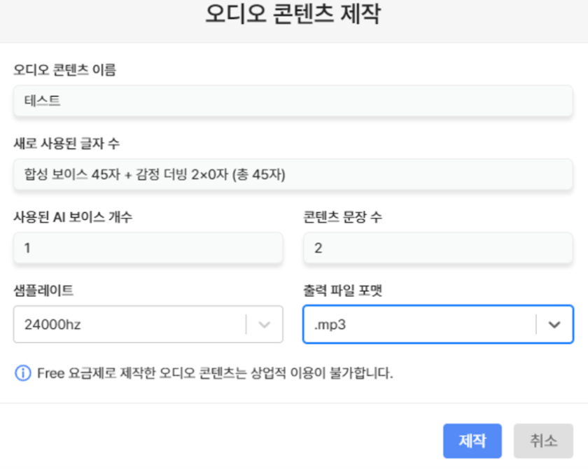 ▶ 제작할 오디오 콘텐츠 설정을 확인하시고 출력 파일 포맷을 선택하시고 '제작' 버튼을 클릭해주시면 되십니다.