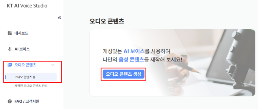 ▶ 상단의 스튜디오 탭을 클릭하신 후 하부 메뉴에서 '오디오 콘덴츠'가 나옵니다. '오디오 콘텐츠'를 클릭하신 후 '오디오 콘텐츠 생성' 을 클릭하시면 오디오를 만드실 수 있습니다.