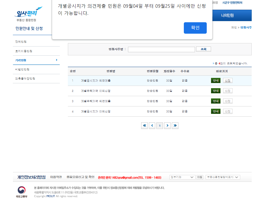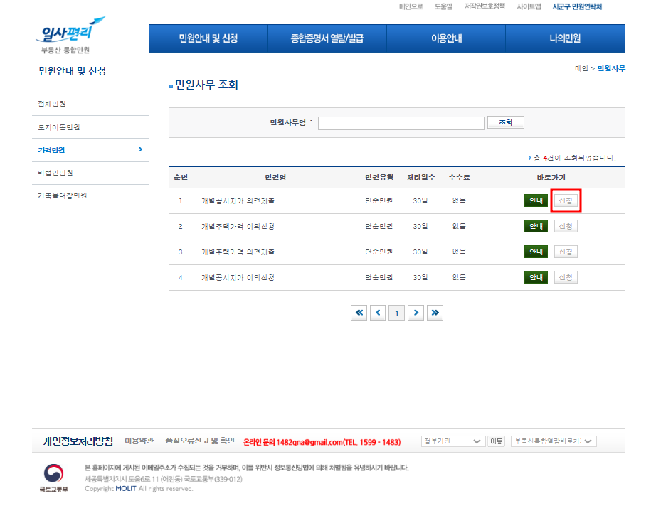 ▶ '가격민원' 클릭 후 '개별공시지가 의견제출'에서 신청하기버튼을 클릭해주시면 됩니다.