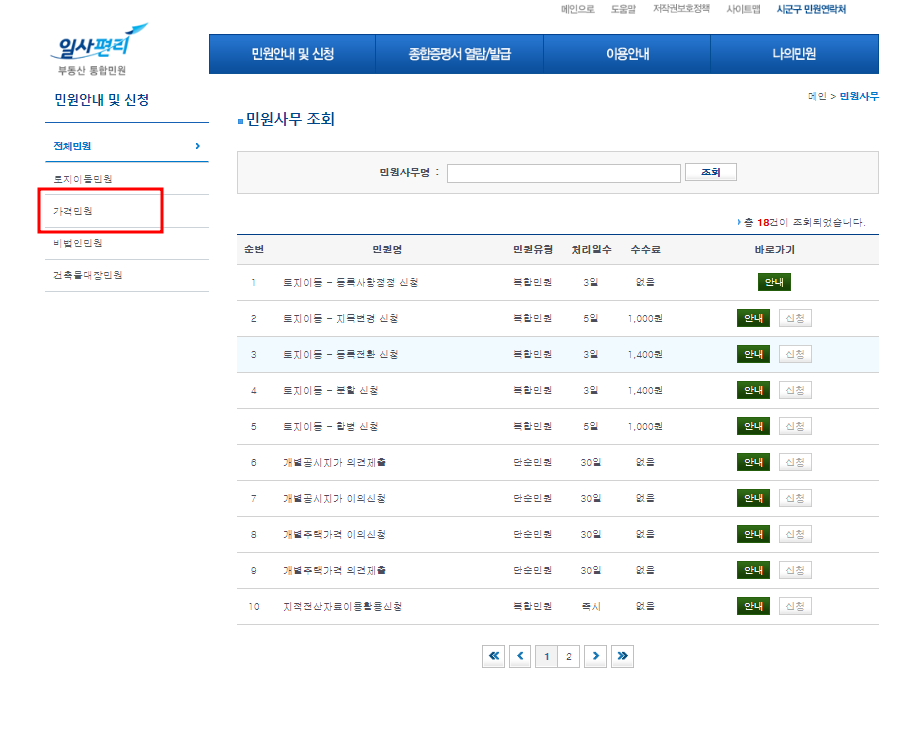▶ '민원안내 및 신청' 버튼 클릭 후 하부 메뉴에서 '가격민원'을 클릭해주시면 됩니다.
