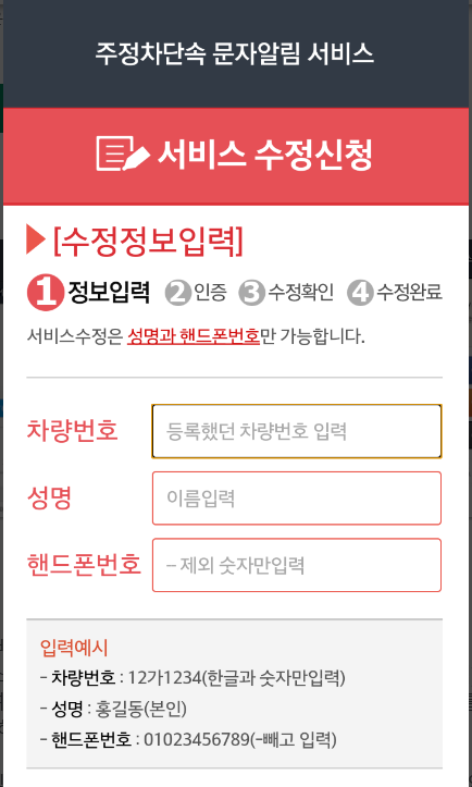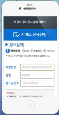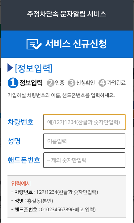 ▶ '가입신청' 버튼을 클릭하신 후 차량번호, 성명, 핸드폰 번호를 입력하시면 됩니다.