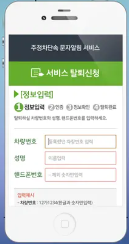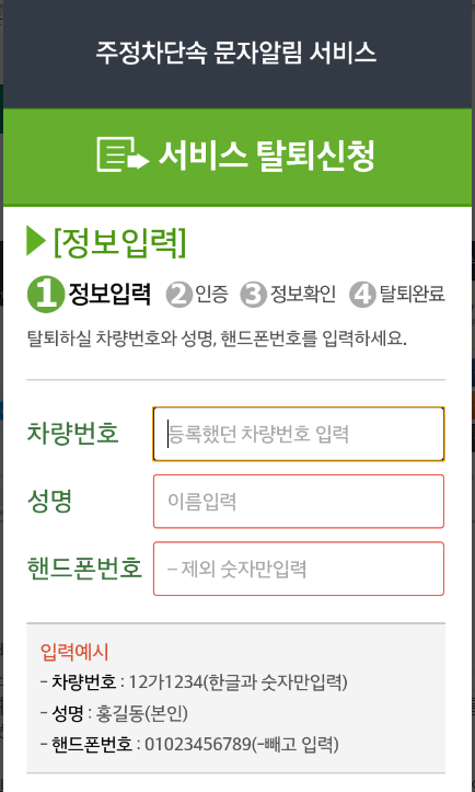 ▶ 추정차 단속 알림 서비스를 탈퇴하시려면 ' 탈퇴신청' 버튼을 클릭하신 후 개인정보를 입력하신 후 탈퇴하실 수 있습니다.