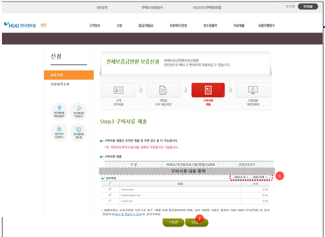 - ①을 클릭하여 전세보증금반환보증 관련한 서류안내 내용을 확인합니다.