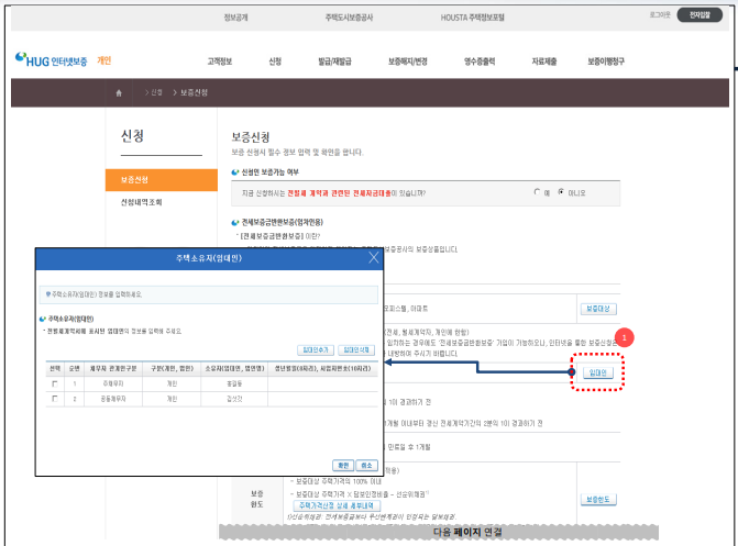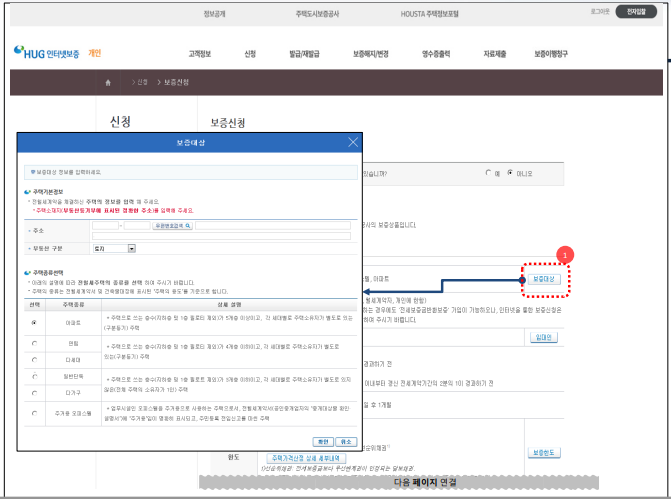 - 보증대상인 주택 기본정보 주소를 입력하고 주택유형을 선택합니다.