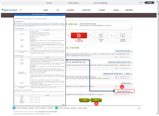 - ①을 클릭하시면 임차인용 개인정보제공 동의서 주요 내용을 확인하실 수 있으며, 항목에 체크하시면 됩니다.