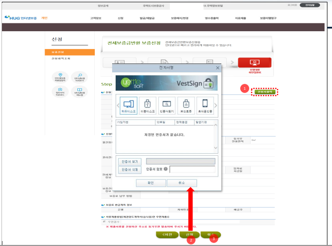 - ③ '취소'버튼을 클릭하시면 전세보증반환보증 신청 접수를 취소할 수 있습니다.