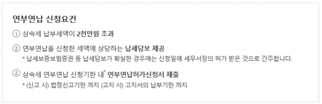 - 연부연납을 허가받은 경우에는 상속세 분납이 허용되지 않습니다.