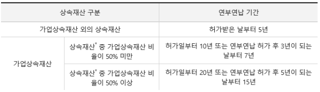 - 연부연납기간은 상속인이 신청한 기간으로 하되, 아래 기간 내에 가능합니다.