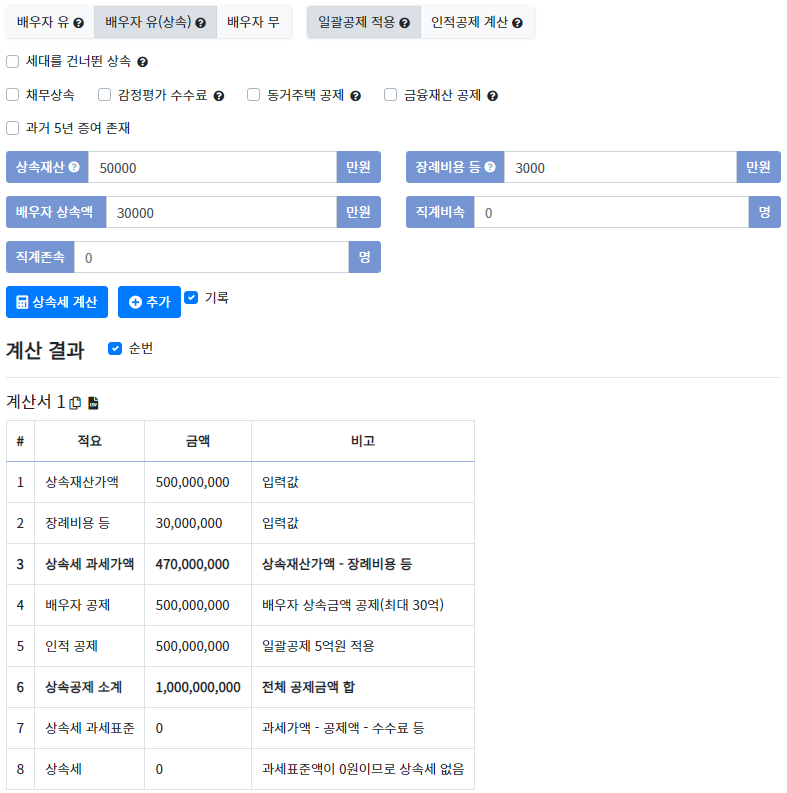 ▶ 상속세 계산기 (예시. 5억원 상속세)