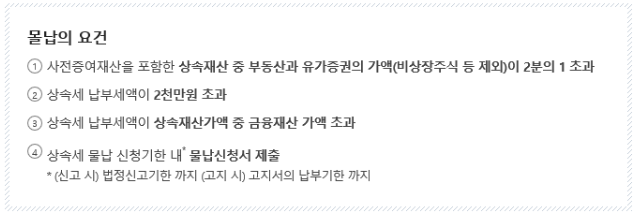 - 상속세 신고 시 납부해야 할 세액이나 납세고지서 상의 납부세액이 2천만원을 초과하는 때에는 아래 요건을 모두 충족하는 경우에 피상속인의 주소지를 관할하는 세무서장으로 부터 연부연납을 허가받아 일정기간 동안 분할하여 납부할 수 있습니다.