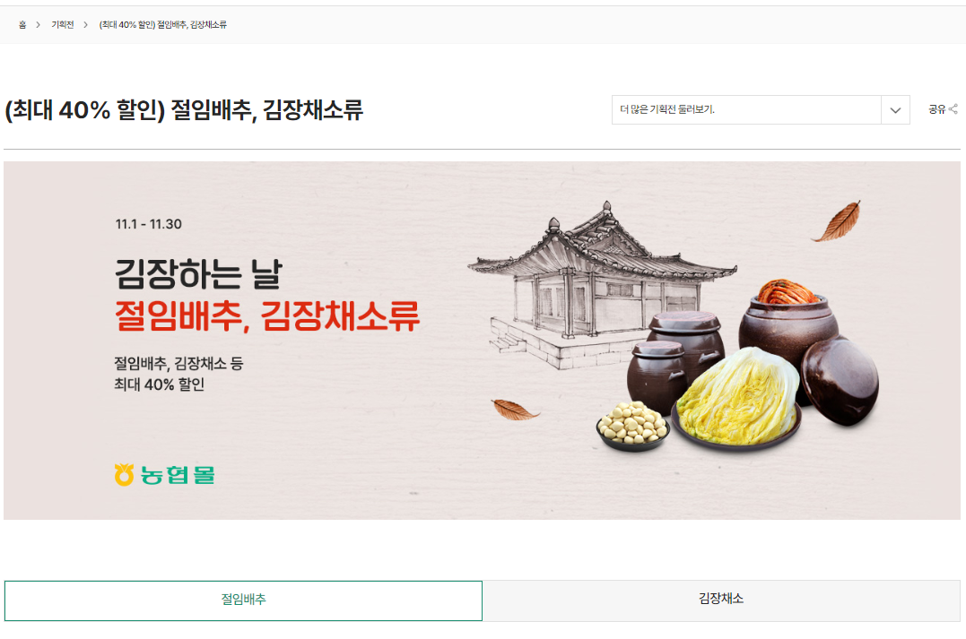 농협 하나로 마트에서는 김장철을 맞이하여 11월 30일까지 정부 할인쿠폰(최대 2만 원 한도, 20% 할인)과 제휴 카드 할인 등 다양한 혜택들을 더해 최대 40%까지 할인된 가격으로 구입할 수 있습니다.