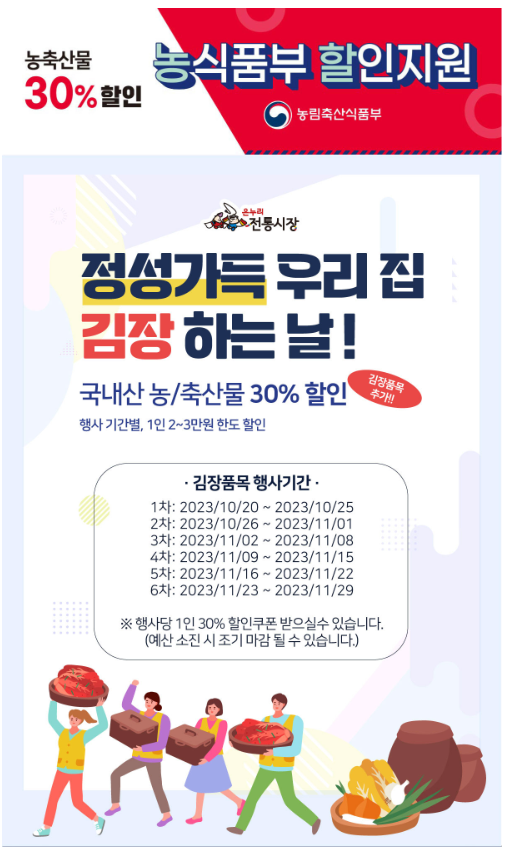 전통사장에서도 김장재료 정부 할인쿠폰 30%를 적용해서 구입하실 수 있습니다. 전통시장 홈페이지에 들어가시면 김장재료 구입시 정부에서 지원해주는 할인 쿠폰을 받으실 수 있습니다.