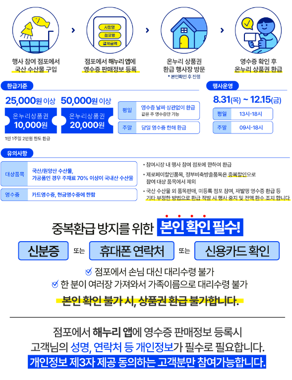 올 해 연말까지 전통시장에서 행사 참여 점포에서 국산 수산물을 구입하시게되면 일정금액을 온누리 상품권으로 환급받으실 수 있습니다. 환급방법은 다음과 같이 구매 영수증을 각 전통시장에 위치한 행사부스로 가져가셔서 교환하시면 됩니다.
