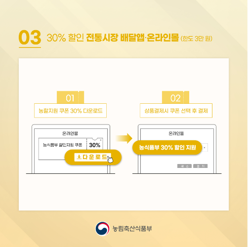 ▶ 전통 시장 배달앱, 온라인몰 : 3만원 한도, 30% 할인