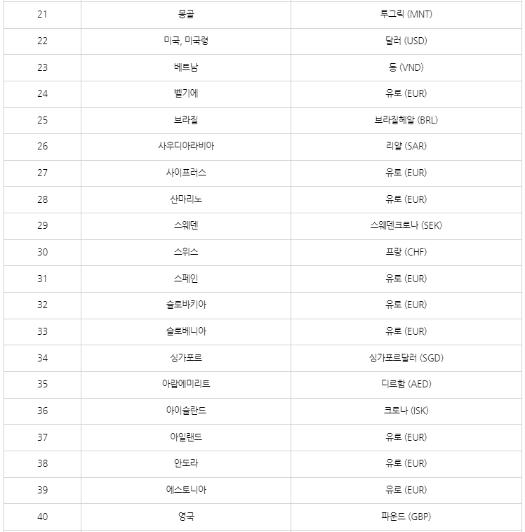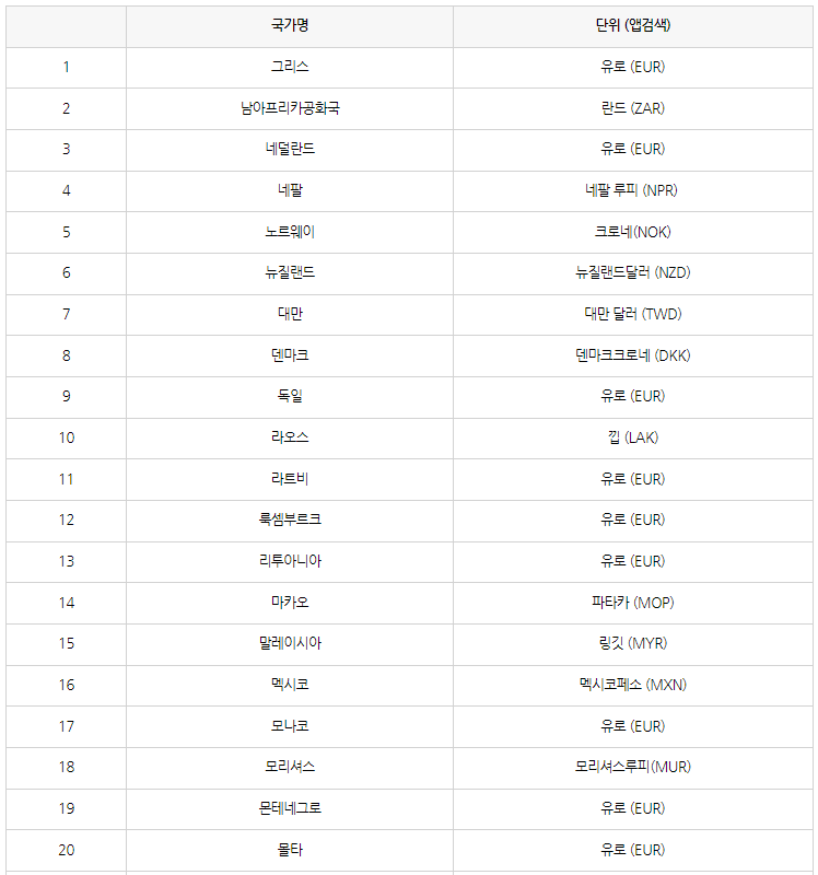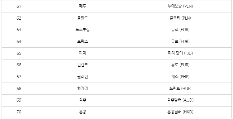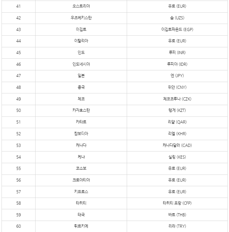 트래블월렛 사용 가능 국가(통화)