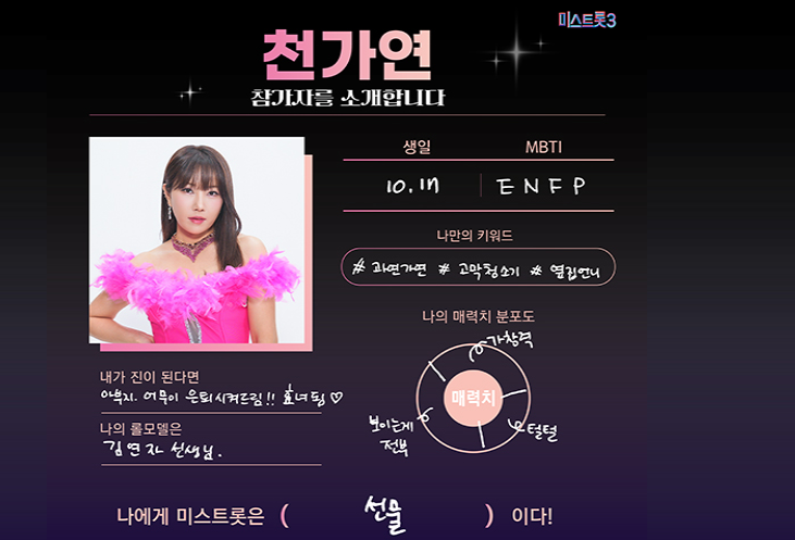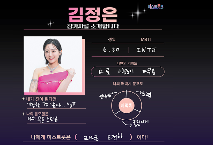 무대 위의 반짝이는 별, 그녀들의 목소리는 마법 같아서 감성을 자극하는 노래로 여러분의 마음을 사로잡을 준비가 되어 있습니다. '미스트롯 3'에서 그녀들의 매혹적인 무대를 기대하세요!