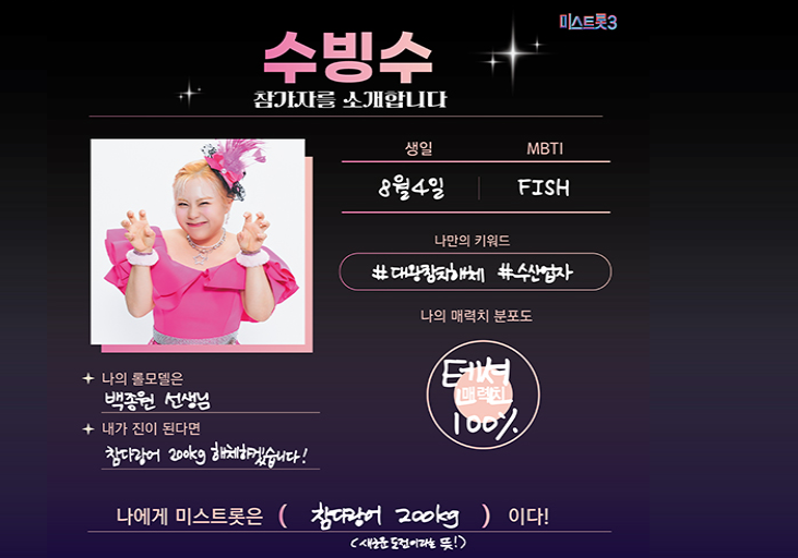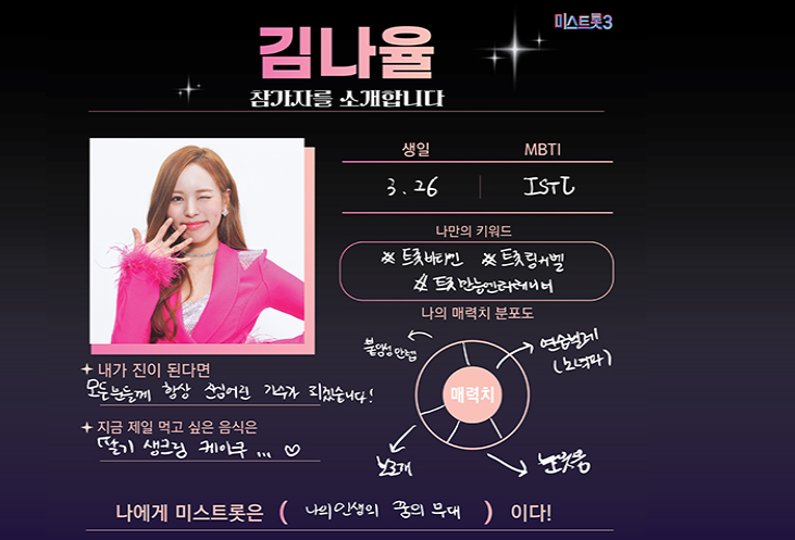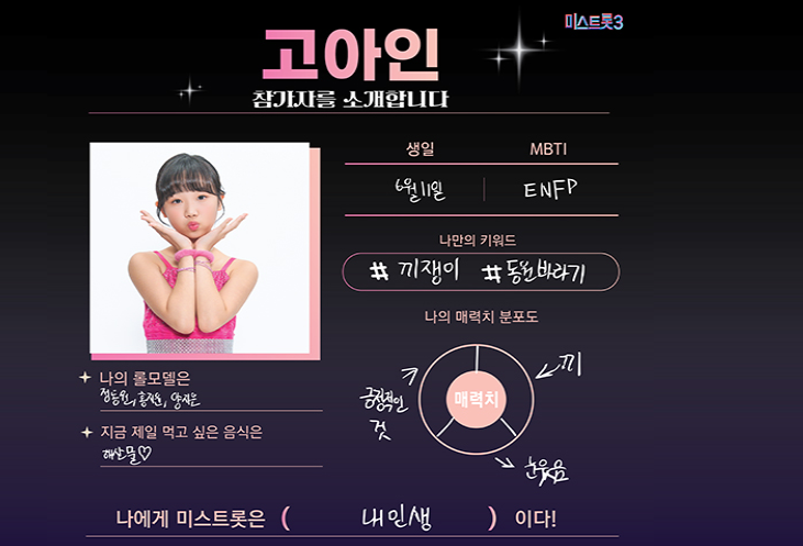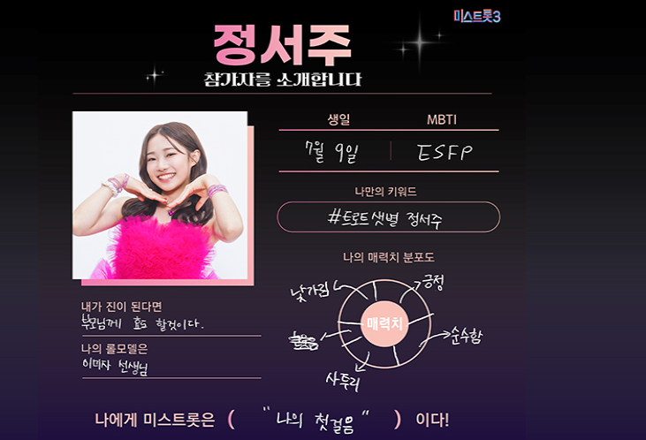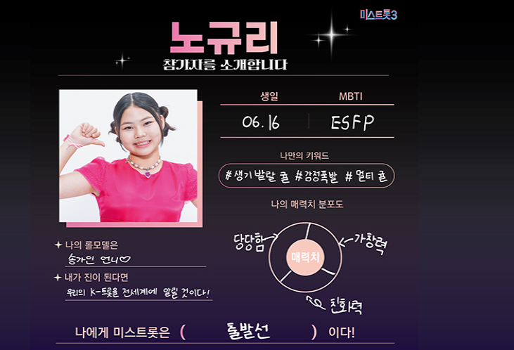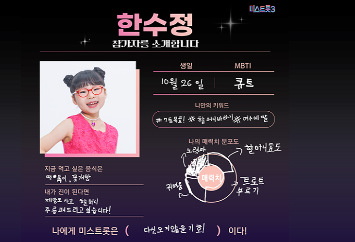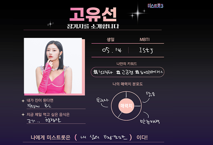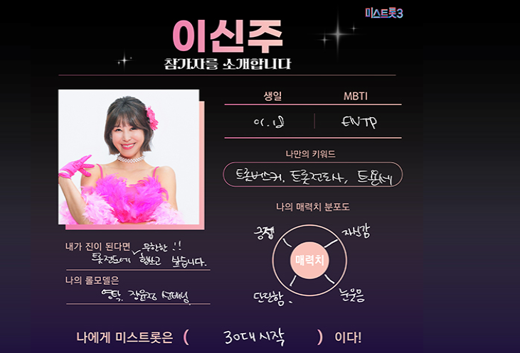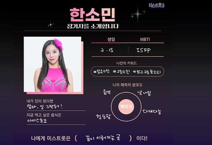 각 참가자의 무대를 통해 새로운 트로트의 매력을 발견하고, 그들의 열정과 꿈을 응원해 주세요. 이들의 여정은 여러분의 응원과 관심으로 더욱 빛나게 될 것입니다.