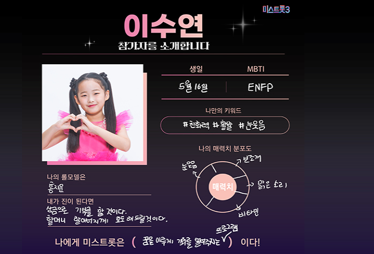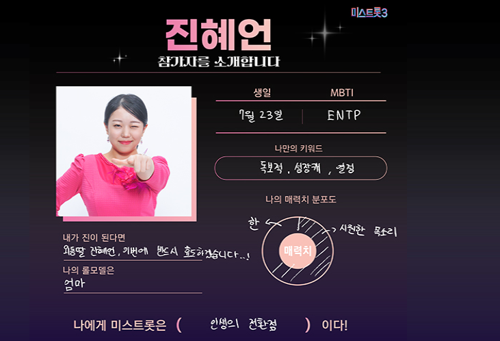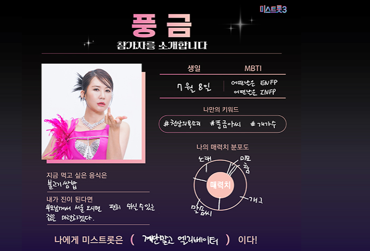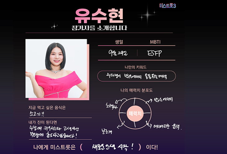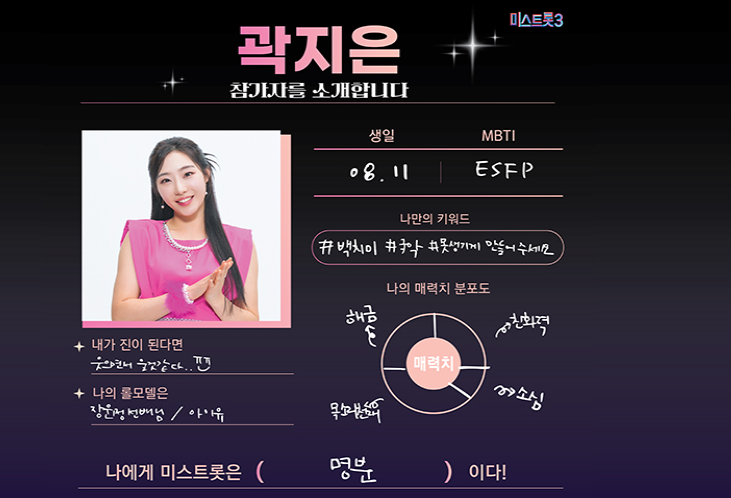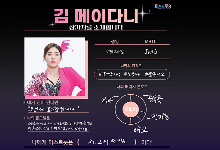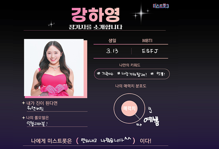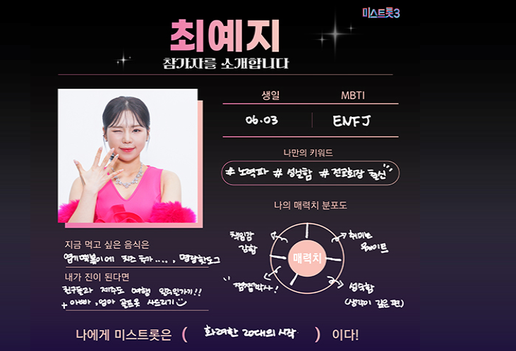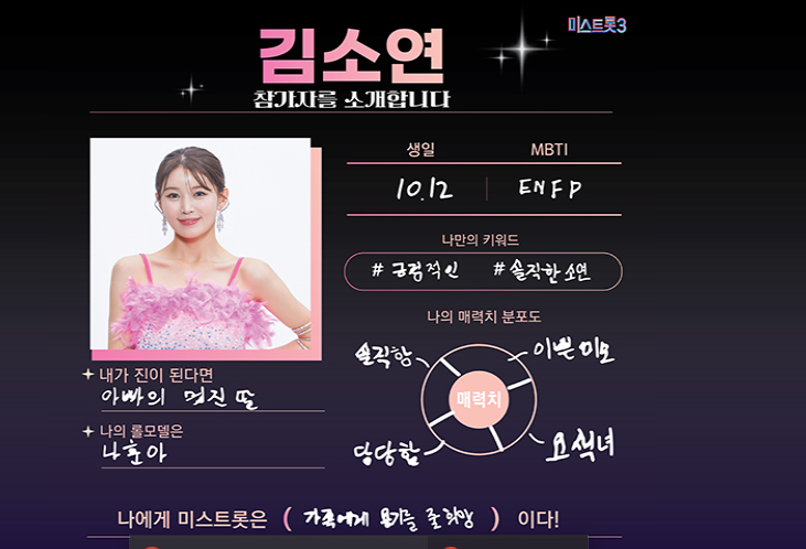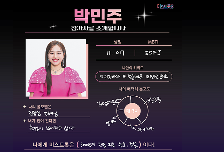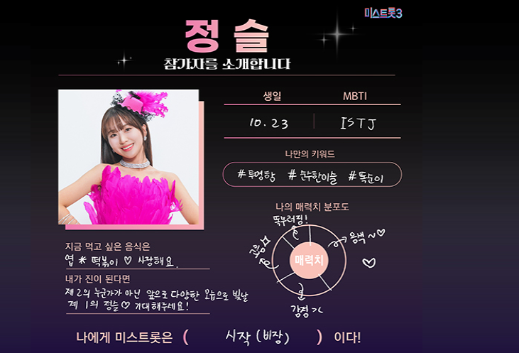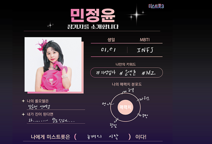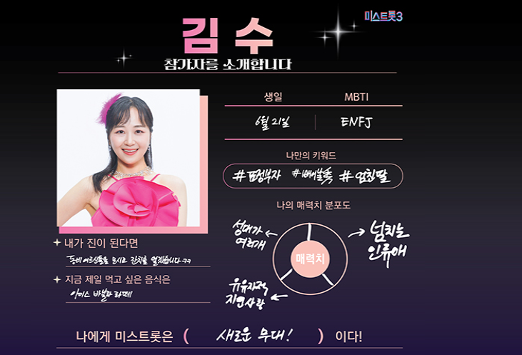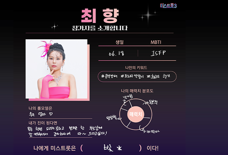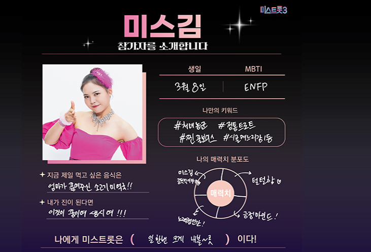 이렇게 다양하고 매력적인 '미스트롯 3'의 참가자들을 소개해 드렸습니다. 각각의 무대가 여러분에게 새로운 감동과 경험을 선사할 것입니다. 이들의 눈부신 무대는 단순한 경연을 넘어, 여러분의 일상에 특별한 색채를 더해줄 것입니다.