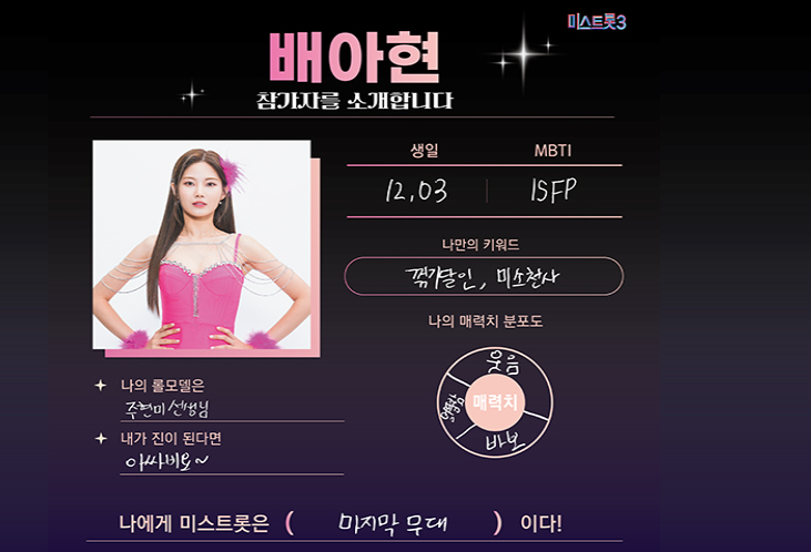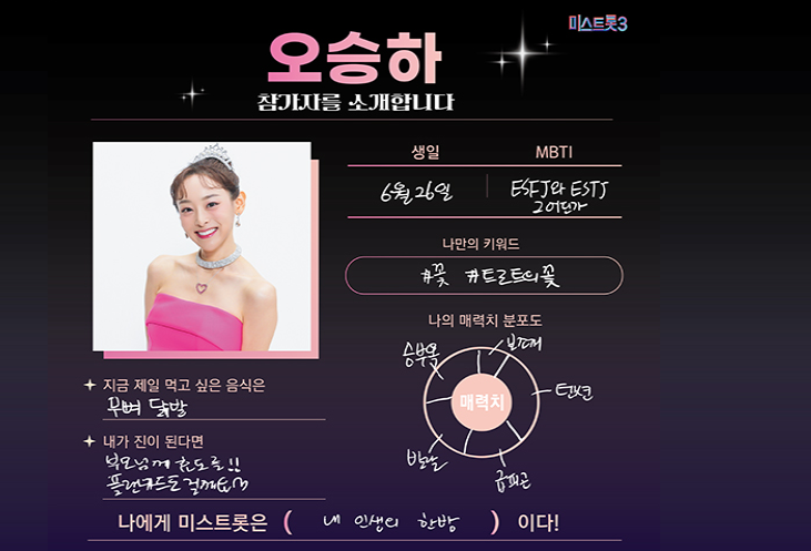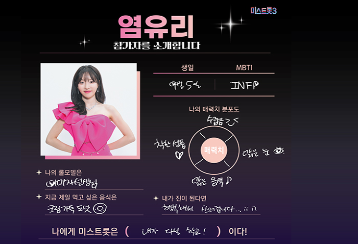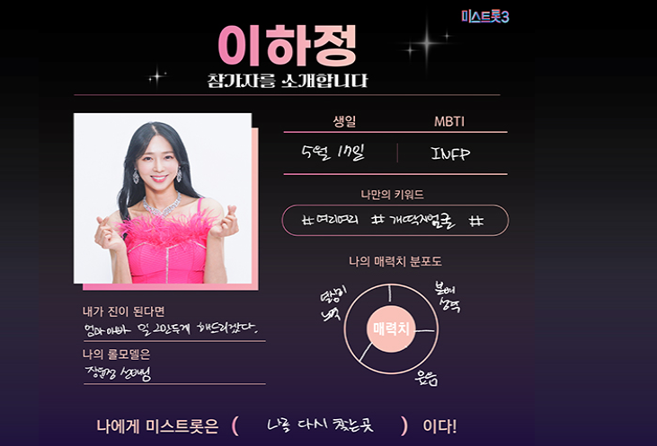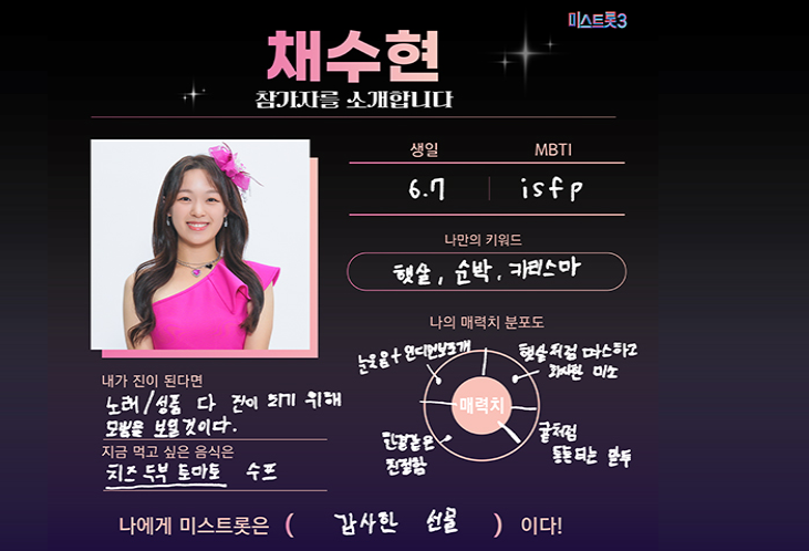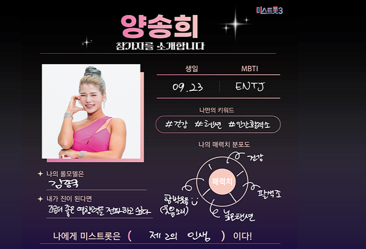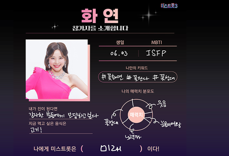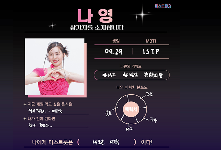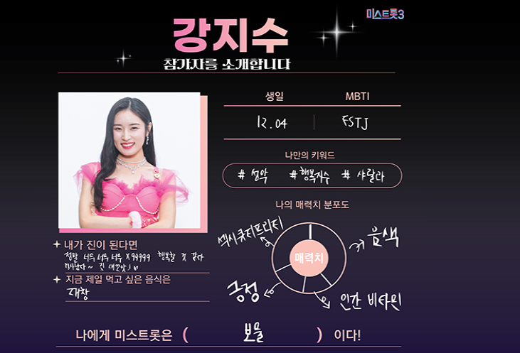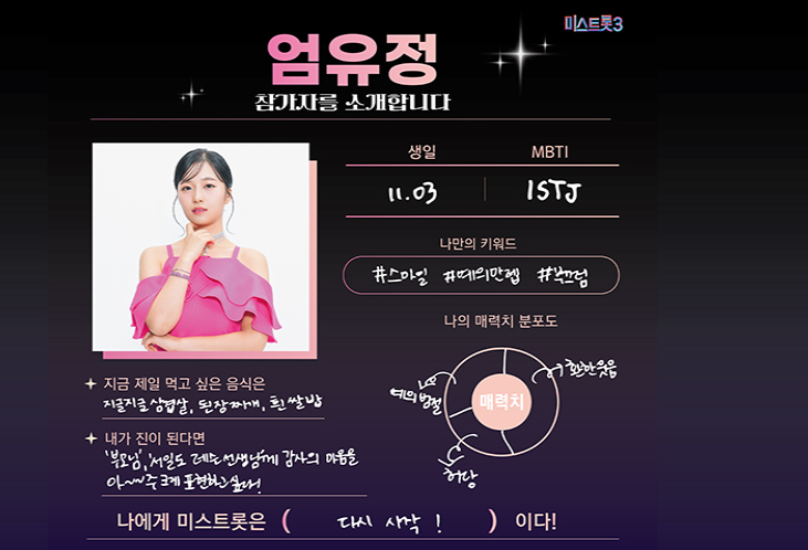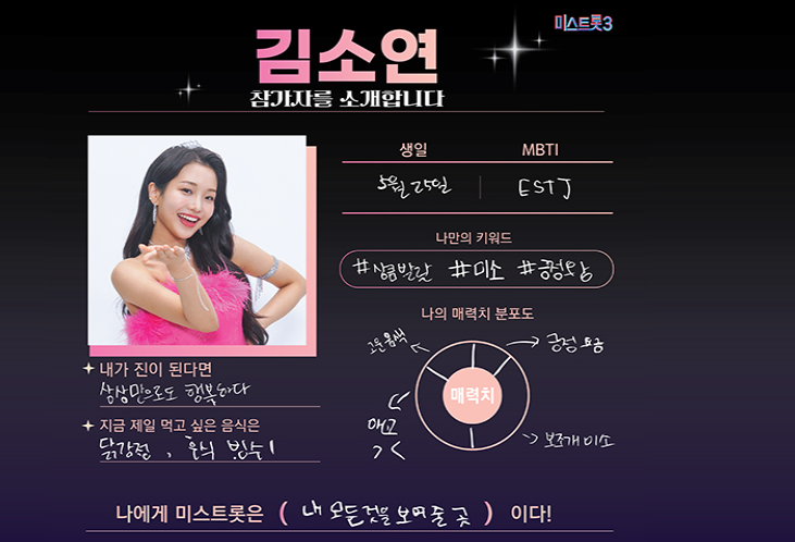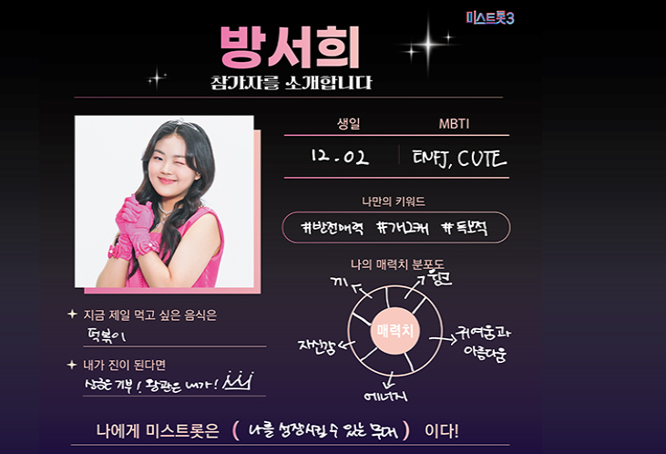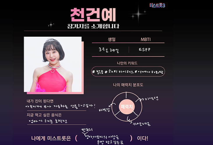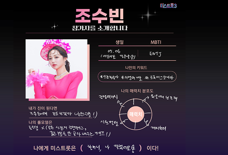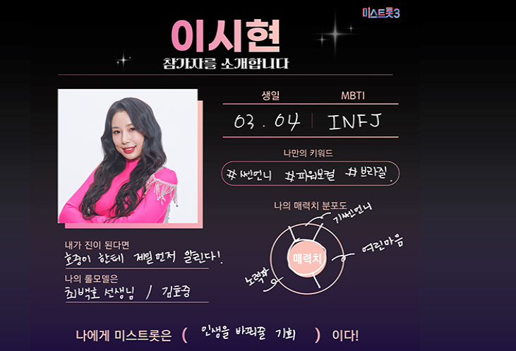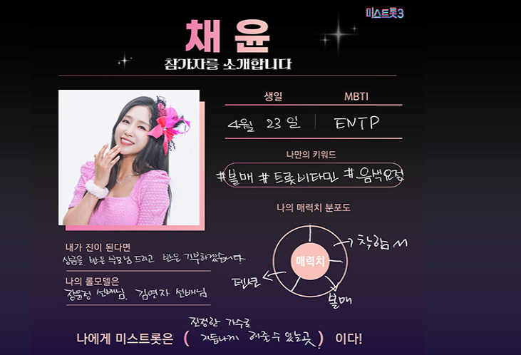 이렇게 다양하고 매력적인 '미스트롯 3'의 참가자들을 소개해 드렸습니다. 각각의 무대가 여러분에게 새로운 감동과 경험을 선사할 것입니다. 이들의 눈부신 무대는 단순한 경연을 넘어, 여러분의 일상에 특별한 색채를 더해줄 것입니다.