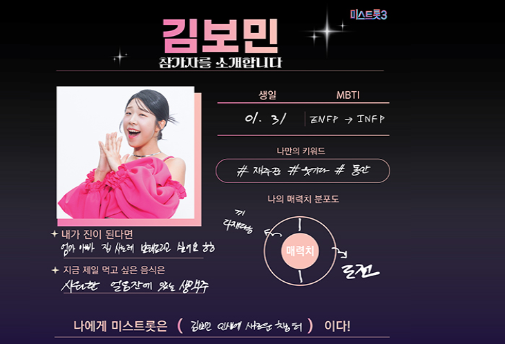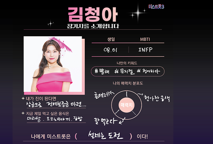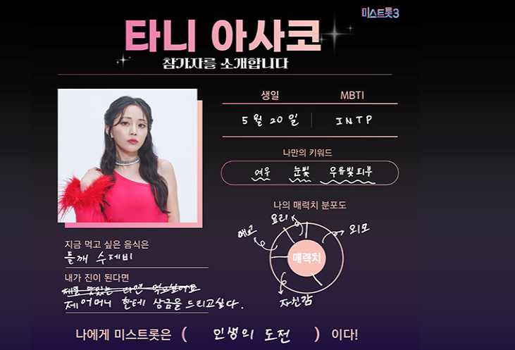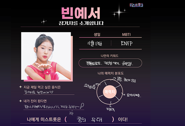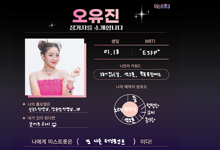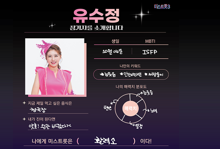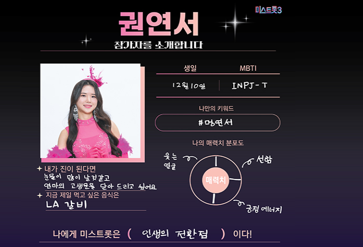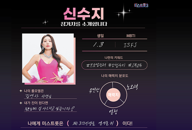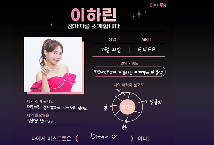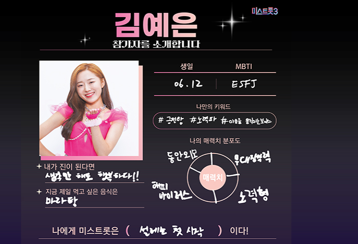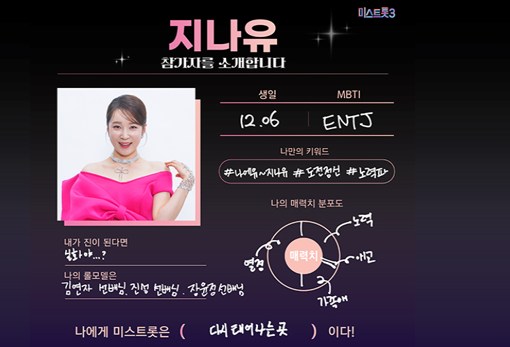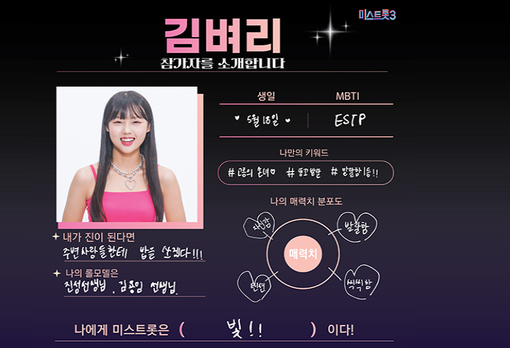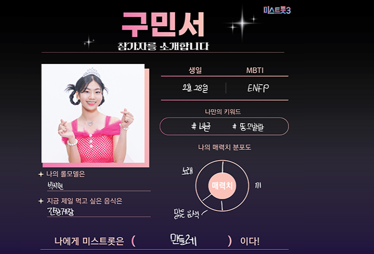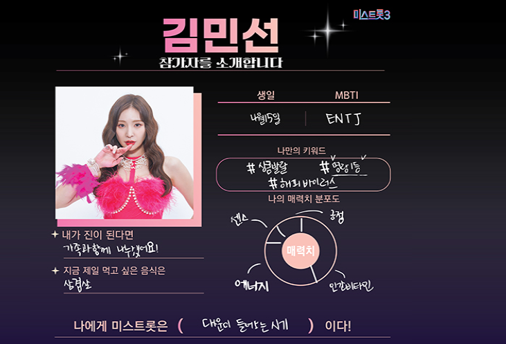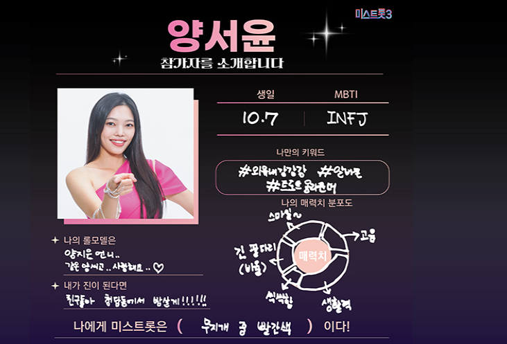 이렇게 다양하고 매력적인 '미스트롯 3'의 참가자들을 소개해 드렸습니다. 각각의 무대가 여러분에게 새로운 감동과 경험을 선사할 것입니다. 이들의 눈부신 무대는 단순한 경연을 넘어, 여러분의 일상에 특별한 색채를 더해줄 것입니다.