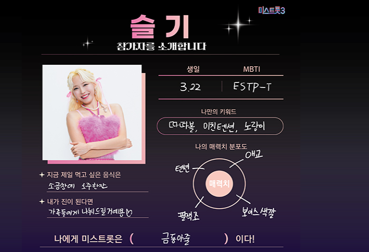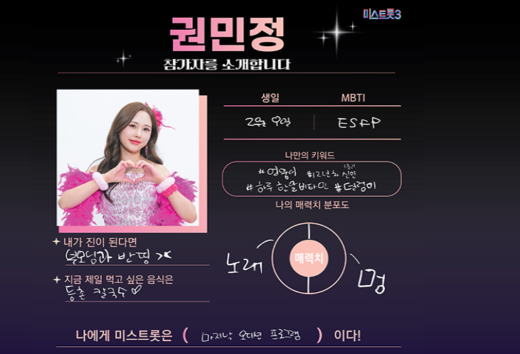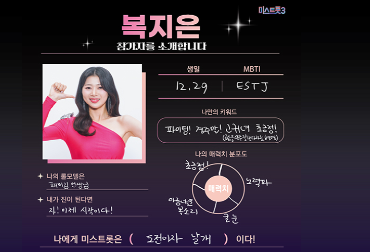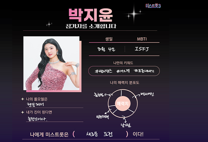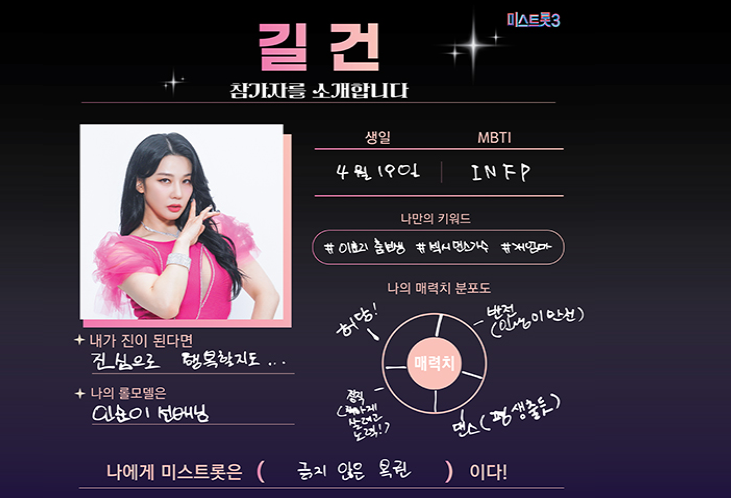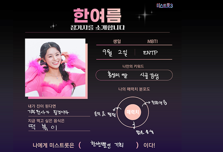 트로트계의 새로운 바람이 될 그녀들의 열정적인 무대는 관객들에게 새로운 에너지를 선사할 것입니다. 그녀들의 파워풀한 무대를 '미스트롯 3'에서 직접 경험해 보세요. 그녀들의 무대 앞에서는 누구도 가만히 서있을 수 없을 거어요!