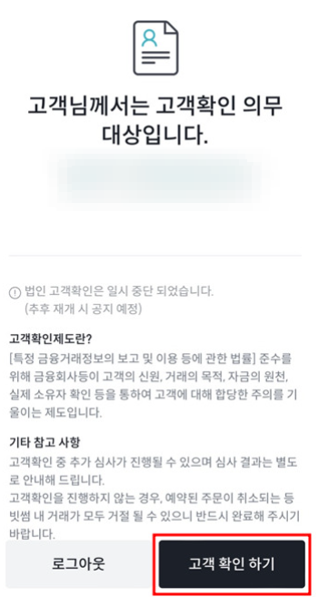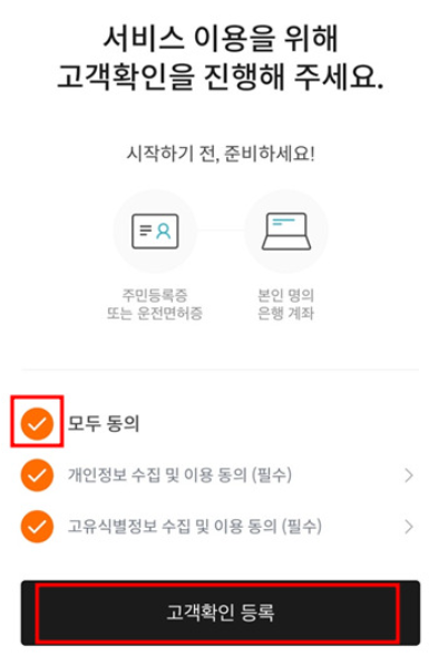 2. 서비스 이용을 위해 고객확인을 진행해 주세요. 라는 팝업창이 뜨시면, 모두 동의를 체크하신 후 '고객확인 등록' 버튼을 클릭해주시면 됩니다.