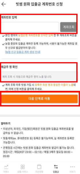 3. 빗썸 원화 입출금 계좌번호 및 예금주 입력 후 '다음 단계로 이동' 버튼을 클릭해주시면 됩니다.