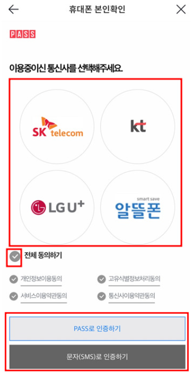 3. 휴대폰 본인확인를 해주시면 되십니다. 가입하신 통신사를 선택하신 후, 전체 동의하기를 체크하신 후 PASS로 인증하기 또는 문자로인증하기 중 한가지를 선택하신 후 인증하시면 됩니다.