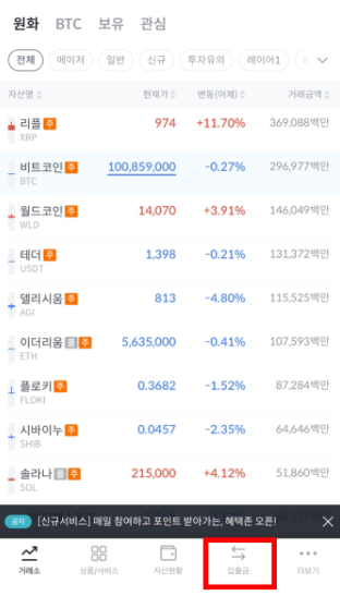 1. 빗썸 로그인을 하신 후 '입출금' 버튼을 클릭해주시면 됩니다.