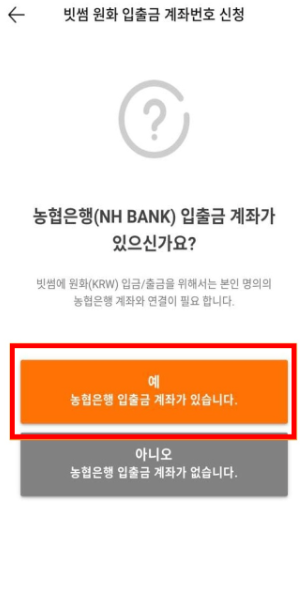 2. 농협은행 입출금 계좌가 있으시면 '예' 버튼을 클릭해주시면 됩니다.