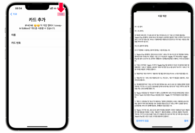 5) 다음으로 등록할 카드의 이름과 명의, 카드 번호 끝자리를 확인할 수 있는데요. 해당 내용이 맞는지 확인한 뒤, 우측 상단의 [다음]을 선택해주세요. 다음을 선택하면 이용 약관이 한번 더 뜨게 되는데요. 내용을 확인한 뒤, 우측 하단의 [동의]를 선택해주시면 돼요.