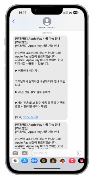 6) 애플페이를 등록했다고 바로 사용은 불가능한데요. 아래 사진 처럼 현대카드사를 통해서 사용 등록이 완료돼었다는 문자를 받아야 돼요.