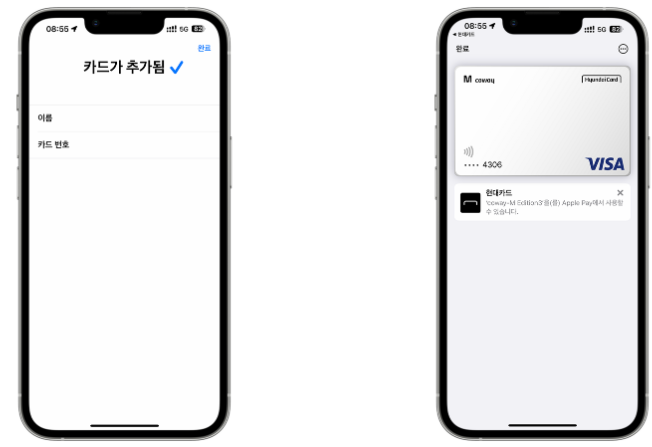 5) 몇 가지 과정을 더 거친 뒤에 카드 추가가 완료되었다는 메세지를 확인할 수 있으며, 애플 지갑에 카드가 등록되어 있어요. 애플워치 또한 현대카드 앱을 통해서 동일한 방법으로 등록이 가능해요.