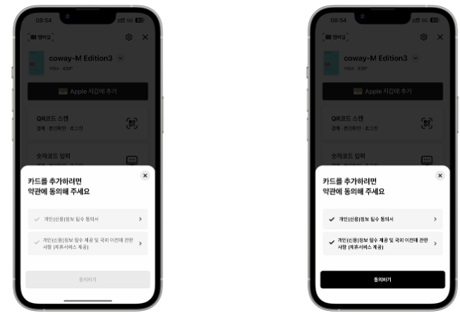 3) 카드를 추가하고 싶은 경우, 약관 동의를 필수로 하셔야 돼요. 개인 정보 필수 동의서와 제휴 서비스 제공에 관한 사항을 읽고 동의를 해주시면 돼요.