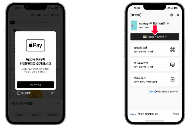 2) 현대카드 앱을 실행하면 아래 사진 처럼 등록 페이지로 바로 연결되는 팝업창이 뜨면, 하단의 [카드 추가하기]를 선택하면 빠르게 이동이 가능해요. 만약, 팝업창이 뜨지 않거나 실수로 껐다면 현대카드 앱의 좌측 상단에 있는 [메뉴] 아이콘을 선택한 뒤, 상단에 있는 [Apple Pay 추가하기]를 선택해주시면 돼요. 그러면 현재 앱에 등록되어 있는 현대카드, 그리고 바로 아래에 'Apple 지갑에 추가' 항목이 있는 것을 확인할 수 있는데요. 여기서 [Apple 지갑에 추가]를 선택하면 바로 등록이 가능해요. 만약, 여러 개의 카드 중에서 특정한 하나의 카드를 선택하여 등록하고 싶다면, 카드 이름 옆에 있는 [화살표] 아이콘을 선택한 뒤, 원하는 카드를 선택하면 돼요.