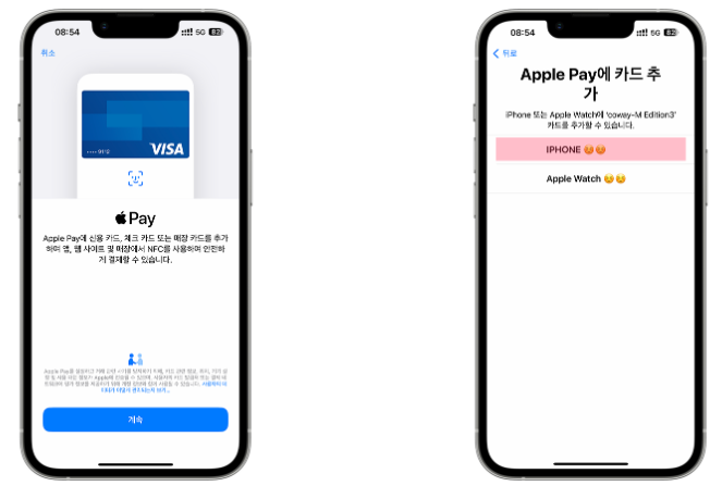 4) 약관 동의 후에는 애플 페이에 대한 간략한 설명이 나오는데요. 내용 확인 후, 아래의 [계속]을 선택해주시면 돼요. 그러면, '애플 페이에 카드 추가'라는 화면이 나오는데요. 아이폰과 애플워치를 둘 다 사용하고 계시다면 아래의 사진처럼 아이폰과 애플워치가 모두 나오게 되며, 아이폰만 있는 경우에는 바로 아래 단계로 넘어가면 돼요 .