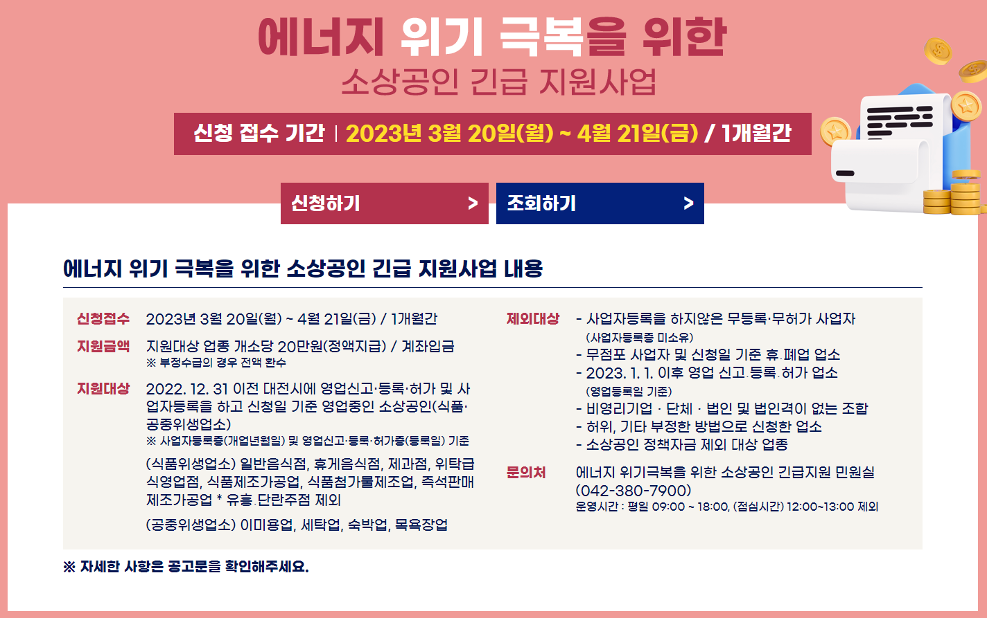 지원대상에 해당되면 업종 개소당 정액으로 총 20만원이 계좌로 입금되는 사업으로 대전 관내 사업자 등록되어 현재 영업 중인 식품위생업소, 공중위생업소 등이 주요 대상이다.