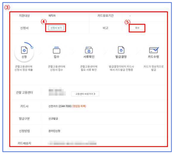 ① 국민내일배움카드 신청내역에 대해 ‘카드신청내역’ 메뉴를 이용하여 확인 할 수 있습니다.
