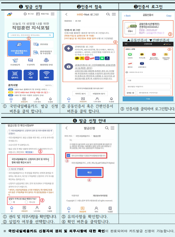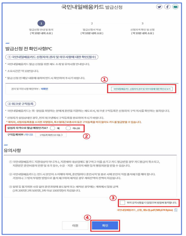 ① 국민내일배움카드 발급 전 반드시 국민내일배움카드 신청자의 권리 및 의무사항에 대한 확인서를 확인하셔야 합니다. ② 워크넷 구직등록여부 확인을 위해 실업자 여부를 선택하셔야 합니다. 실업상태일 경우에는 워크넷 구직등록을 해야 합니다.