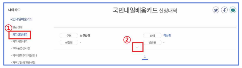 ② ‘펼치기’ 버튼 클릭 시 ③ 과 같이 국민내일배움카드 기본 신청 내역이 보여집니다.